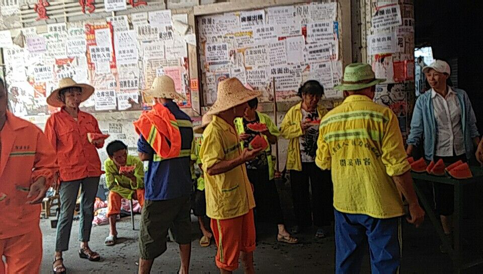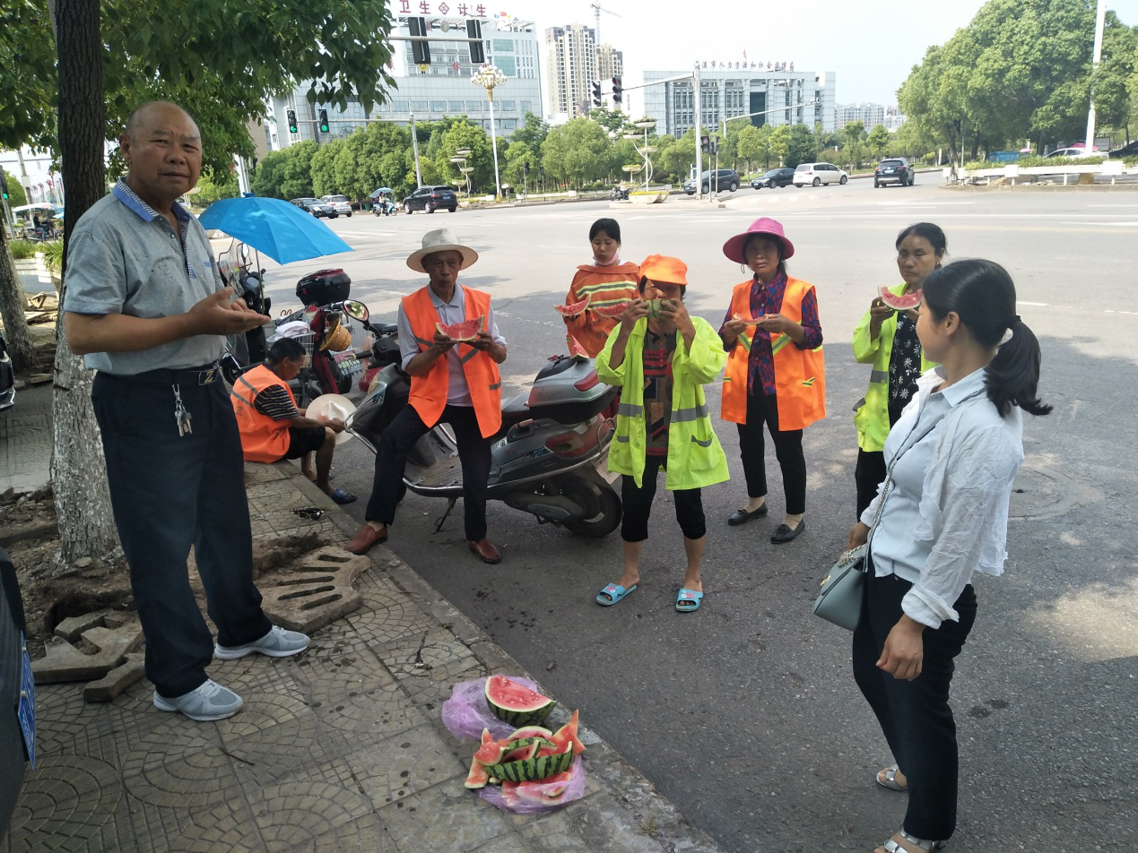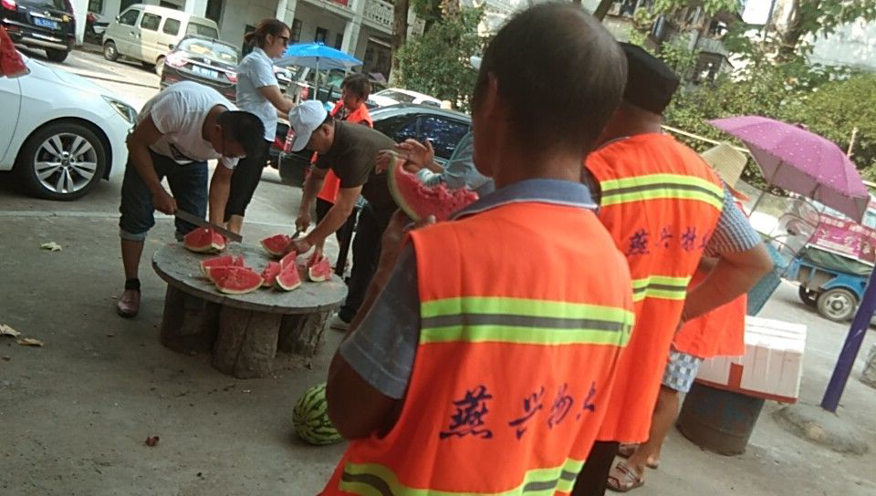 午后正是最熱的時候,為緩解高溫給環衛工人帶來的不適,8月1日,江西燕興物業管理有限公司鷹潭分公司黨支部組織黨員和公司骨干、管理員,為環衛工人送上清涼的西瓜解暑降溫。 他們讓工人在最熱的時間,集中到一起休息,把西瓜遞到每個工人手上,并對每一位工人道聲“辛苦了”。一位環衛工人邊吃西瓜邊說:“謝謝你們!我們習慣了,再苦的工作也得有人做呀,不然城市環境怎么辦?”。樸實無華的回答,顯示出了環衛工人的那份責任心。