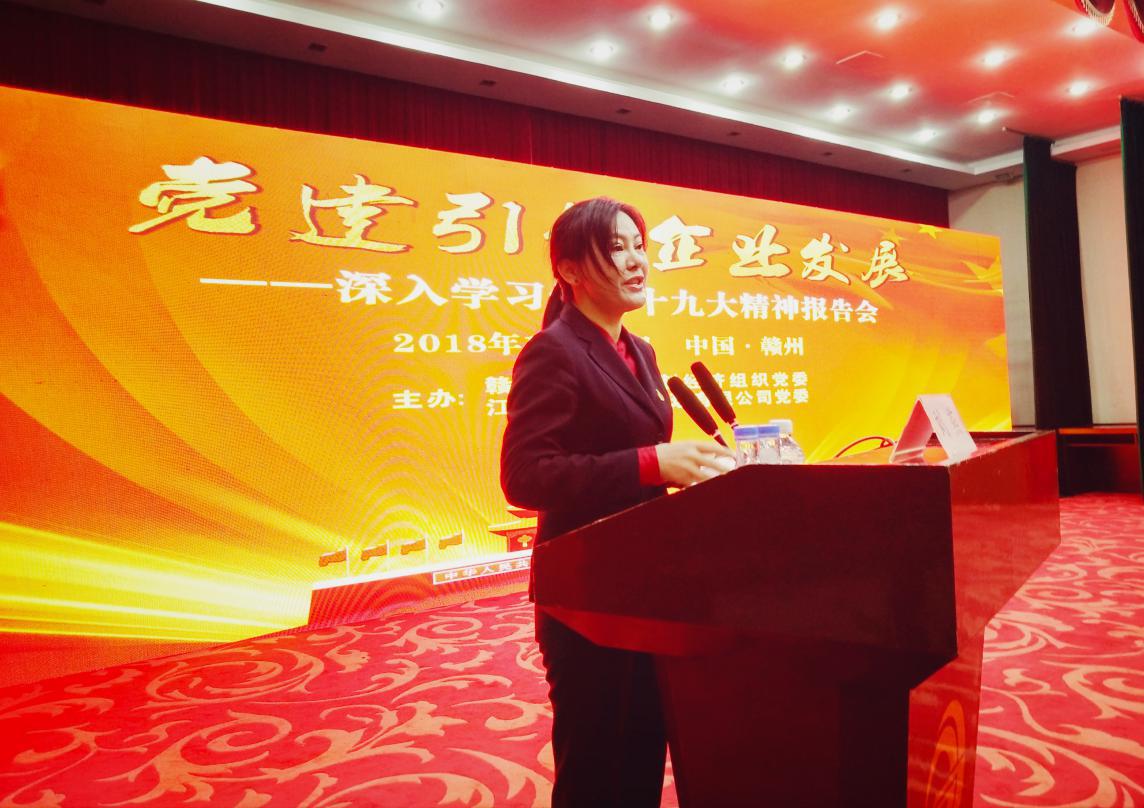 10月26日上午,由贛州市非公經濟組織黨委、江西燕興物業黨委主辦的《黨建引領新發展——宣講黨的十九大精神報告會》在贛南賓館舉辦,黨的十九大代表、河南圓方集團黨委書記、總裁、非公企業黨建學院院長薛榮主講。全市各領域基層黨員干部共計500余人聆聽報告。會議由贛州市委統戰部副部長、贛州市工商聯黨組書記謝來福主持;江西燕興物業黨委書記、董事長劉燕致辭。