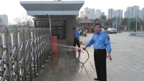 圖:象湖桃源小區保潔員在清掃道路、綠地