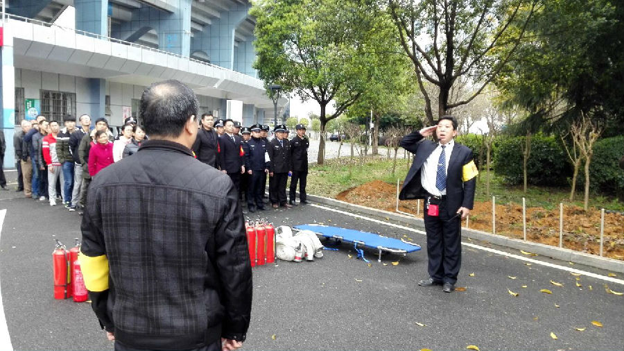 一培訓完,參加演練的全體人員整裝列隊,在演練總指揮的一聲令下,演練正式開始。這次演練的主要內容為通訊報警、警戒保障、疏散救護和行動滅火。現場模擬體育中心某處冒出滾滾濃煙,物業公司接到火警報告后,立即啟動火災應急處置預案,通訊聯絡組、疏散警戒組、滅火行動組、后勤救護組按照預案立刻展開行動。通訊聯絡組立即撥打119、120救援電話;疏散警戒組立刻對各路口進行警戒封鎖,組織被困人員沿著設定的逃生路線有序撤出大樓;滅火行動組第一時間帶著消防水帶、滅火器等消防器材趕到火災地點,將大火有效控制直至撲滅;后勤救護組對在火災現場受傷的人員進行救護,傷情較重的用擔架抬出至安全地帶進行救治……各個環節臨危不亂,環環相扣,操作嚴謹。