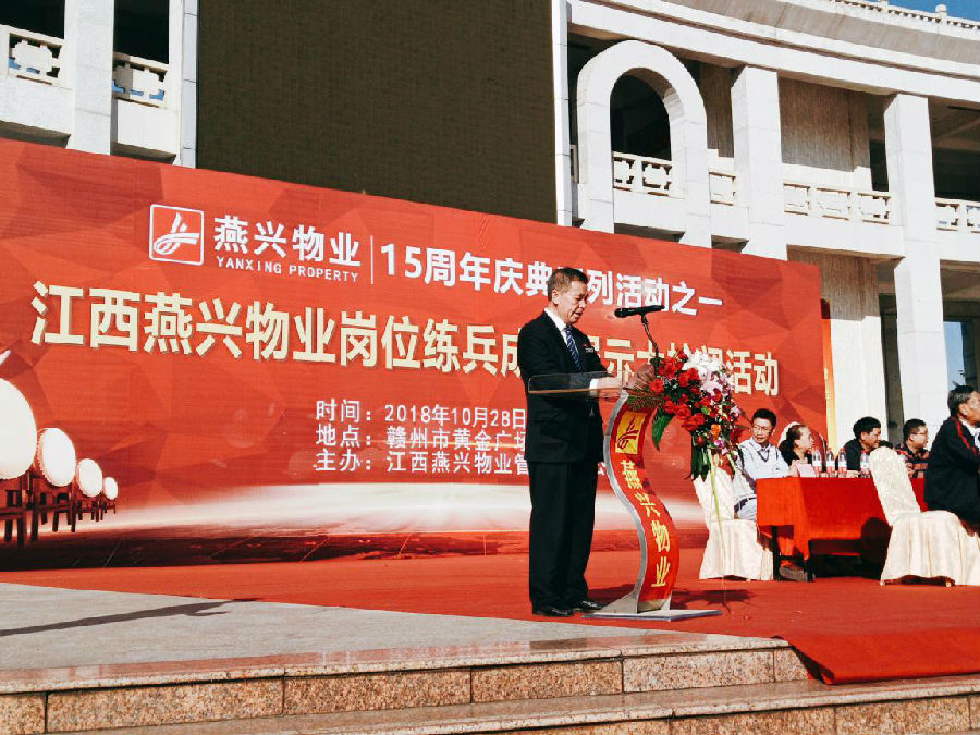 15時20分,黃金廣場艷陽高照,人聲鼎沸,大檢閱活動在莊嚴的《中華人民共和國國歌》聲中拉開帷幕。公司黨委副書記、總經理劉南斗首先發表熱情洋溢致辭。劉總指出:開展崗位練兵成果展示,是我們深入貫徹黨的十九大精神,落實“質量強國”發展戰略,堅持“質量第一”價值導向的重要行動,也是展現物業管理從業人員專業形象和精神風貌,踐行2018年物業管理行業服務質量提升年工作主題,更是增強優質物業服務供給能力、更好地滿足廣大業主對優質物業服務的需求,讓更多的人知道物業,讓更多人了解物業,讓更多的人支持物業的具體舉措。劉總表示,通過這次崗位練兵技能展示,我們要以練兵促提升,以展示促發展,創新行業人才培養、選拔、激勵機制,提高行業從業人員的專業能力和綜合素質,為物業行業轉型升級和高質量發展提供技術支撐和人才保障,讓物業成為有奔頭的產業,讓物業成為有吸引力的職業,讓物業成為讓人尊重的行業。