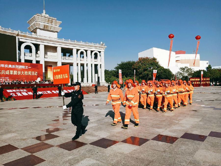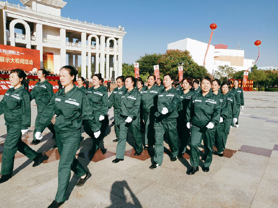 接著,在公司黨委書記、董事長劉燕的一聲令下,分列式演練展示和著《運動員進行曲》正式舉行。旗手陣隊、引路陣隊和黨員方隊、特勤方隊、應急方隊、管理方隊、管家方隊、義務消防方隊、保障方隊、環境管理方隊的隊員們,邁著矯健的步伐,精神抖擻地一一走過檢閱臺。他們步伐整齊劃一,氣勢威武雄壯,口號嘹亮,充分展現了燕興人蓬勃向上的精神面貌和昂揚奮發的工作斗志。