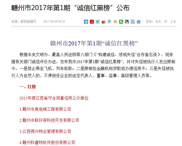 近日,贛州市精神文明建設(shè)指導(dǎo)委員會辦公室、贛州市工商行政管理局和贛州市中級人民法院聯(lián)合發(fā)布“贛州市2017年第1期‘誠信紅黑榜’”,江西燕興物業(yè)管理有限公司等40家公司上了紅榜,被評為“2015年度江西... 2017-04-11