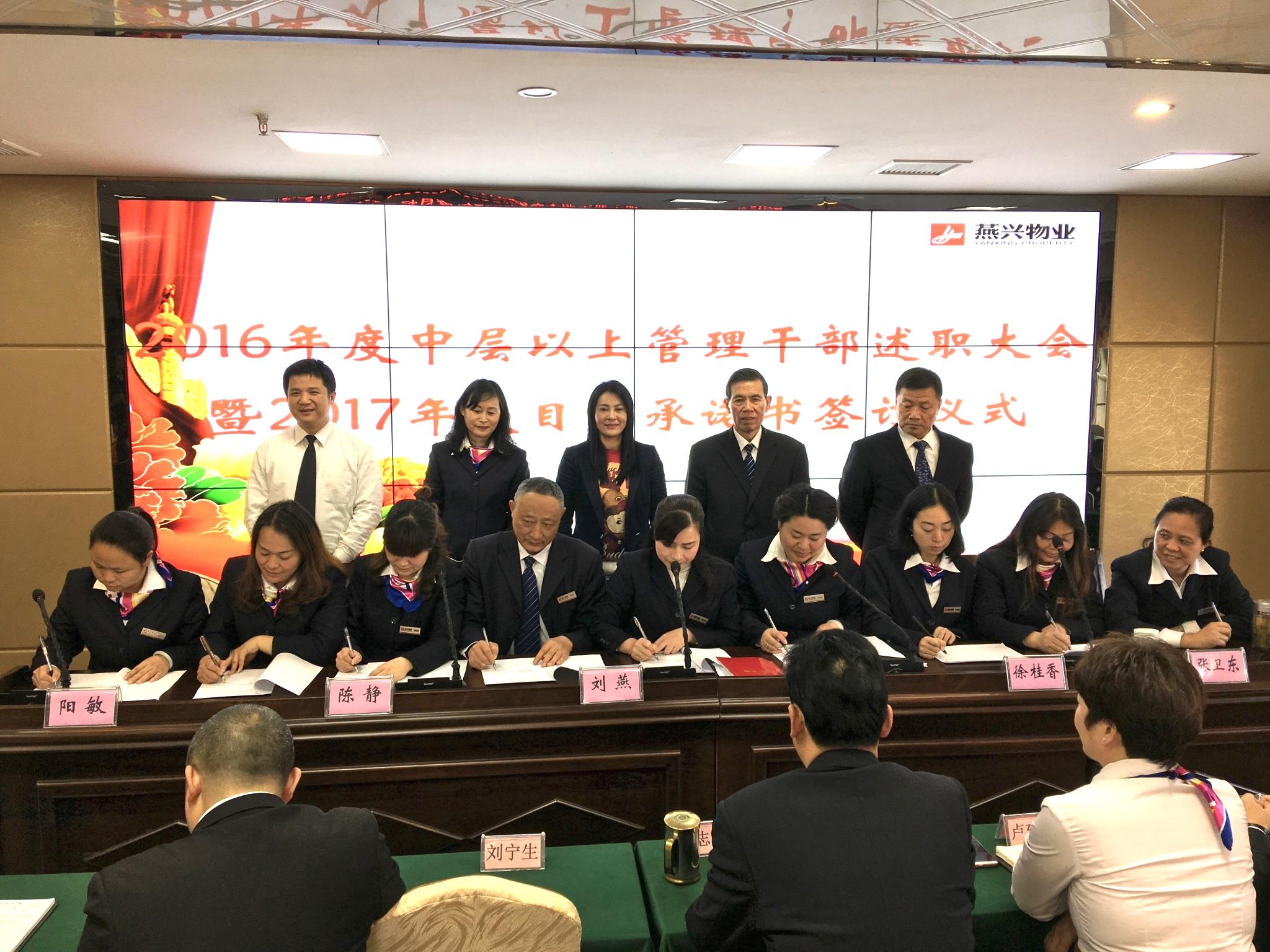 2017年2月17日,江西燕興物業管理公司在公司大會議室召開2016年度中層以上管理干部述職大會,及舉行2017年度目標承諾書簽訂儀式,公司董事長劉燕,總經理劉南斗,常務副總經理陳靜,副總經理徐桂香、陽... 2017-02-18